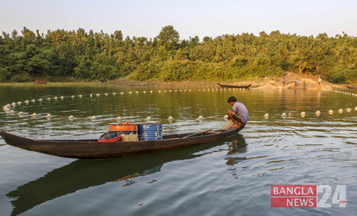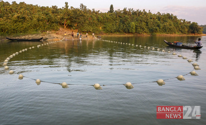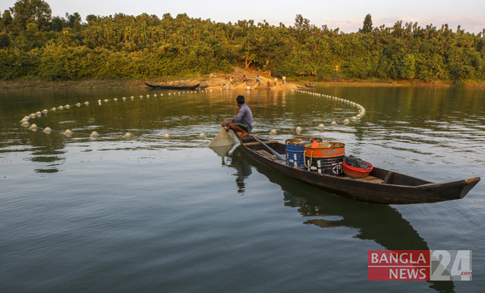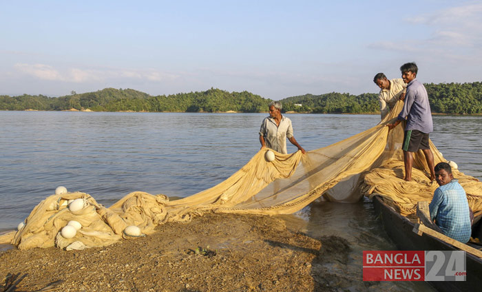 চট্টগ্রামের কাপ্তাই লেকে মাছ ধরছেন জেলেরা। ছবি উজ্জ্বল ধর