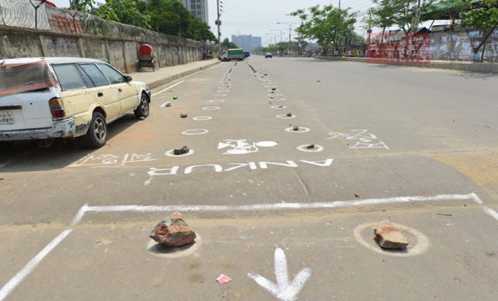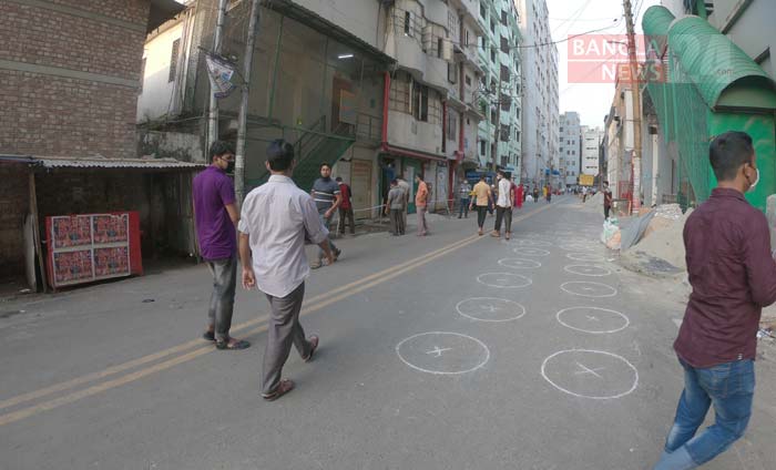 পথচারীদের সামাজিক দূরত্ব বজায় রাখতে সড়কে গোল চিহ্ন, ছবিটি মিরপুর থেকে তুলেছেন রাজীন চৌধুরী।