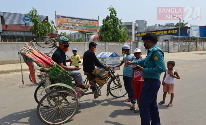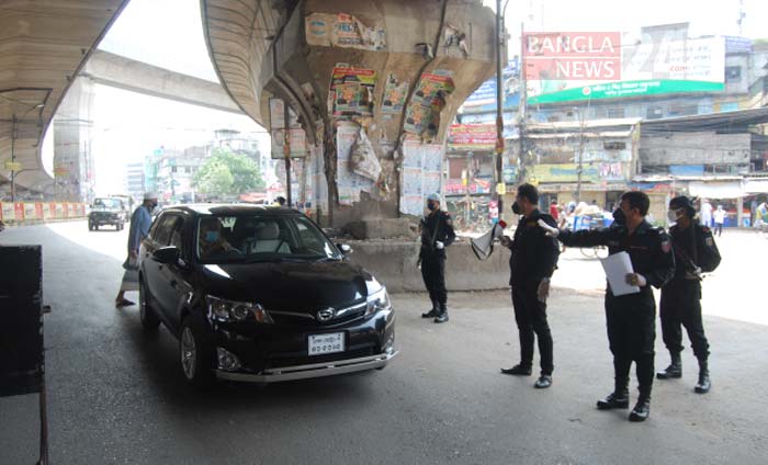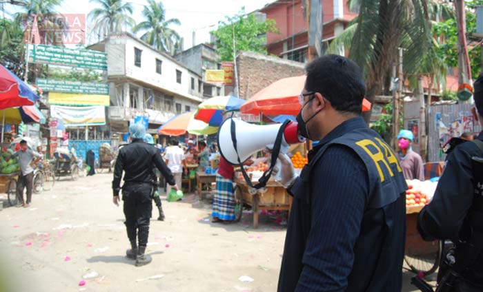 হ্যান্ড মাইক্রেফোন নিয়ে পথচারীদের সচেতন করছেন র্যাব সদস্যরা। ছবি: ডিএইচ বাদল