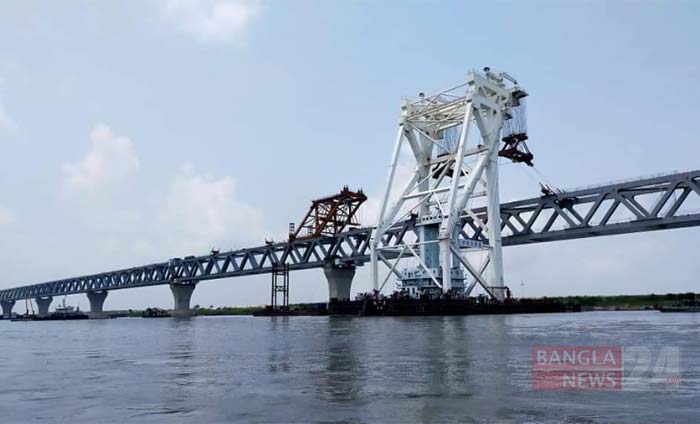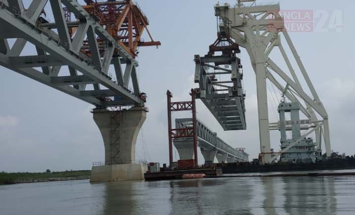 মুন্সিগঞ্জের মাওয়া প্রান্তে সেতুর ১৯ ও ২০ নম্বর পিলারের ওপর ২৯তম স্প্যানটি স্থায়ীভাবে বসানো হয়েছে। ফলে দৃশ্যমান হলো পদ্মাসেতুর ৪ হাজার ৩৫০ মিটার। ছবি: সাজ্জাদ হোসেন