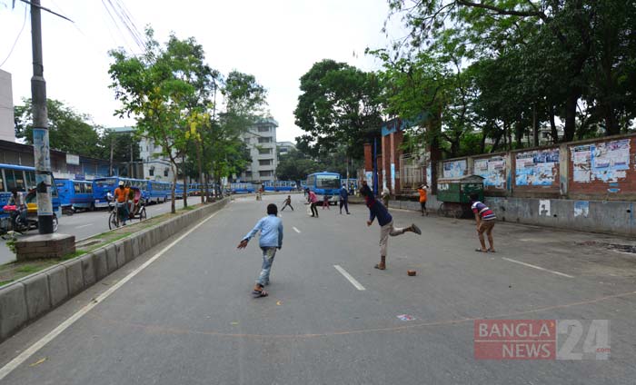 ফাঁকা সড়কে ক্রিকেট খেলায় মেতেছে একদল কিশোর। ছবিটি রাজধানীর মিরপুর ১৪ নম্বর এলাকা থেকে তুলেছেন জিএম মুজিবুর।