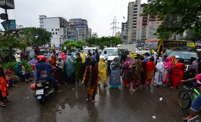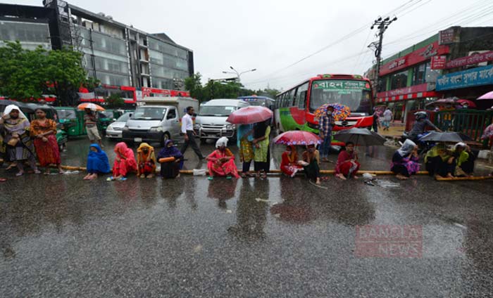 রাজধানীর মিরপুর-১ নম্বর এলাকায় তিনটি পোশাক কারখানার শ্রমিকরা সড়ক অবরোধ করে রেখেছেন। ছবি: জিএম মুজিবুর