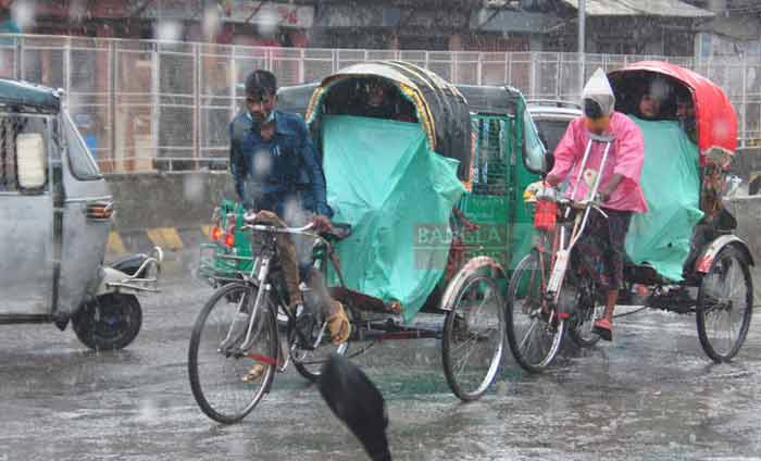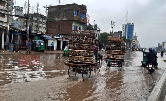বৃষ্টিতে রাস্তায় জমে থাকা পানির মধ্যে চলছে ভ্যান, অটোরিকশা। ছবি: ডিএইচ বাদল