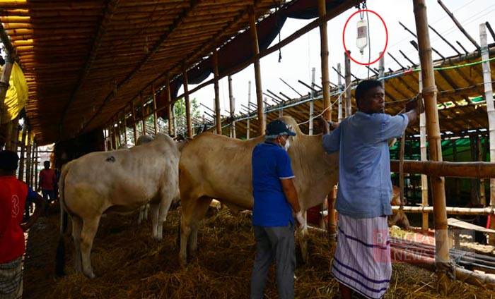 কয়েকদিন পর কোরবানির ঈদ। বেশি দামে বিক্রি আশায় কিছু অসাধু ব্যবসায়ী গরু মোটাতাজা করতে স্যালাইন দিচ্ছে। ছবিটি রাজধানীর গাবতলী হাট থেকে তুলেছেন জিএম মুজিবুর।