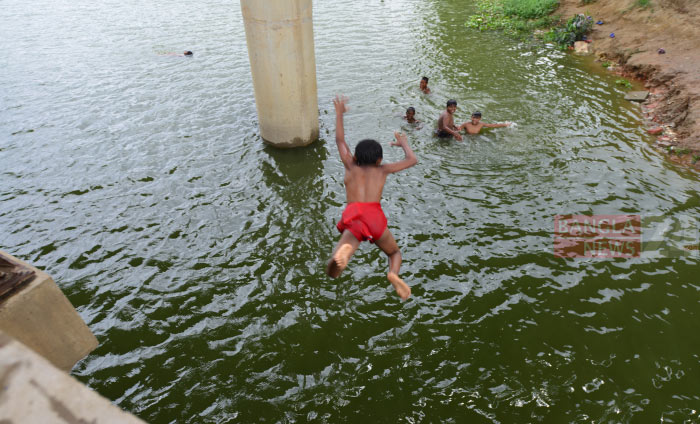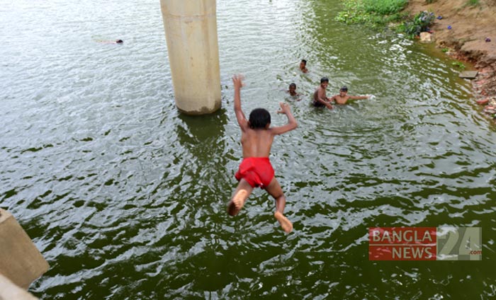 তীব্র গরমে কিছুটা স্বস্তি পেতে লেকের পানিতে শিশুদের লাফঝাঁপ। রাজধানীর বিশ্বরোড এলাকা থেকে ছবিটি তুলেছেন জি এম মুজিবুর