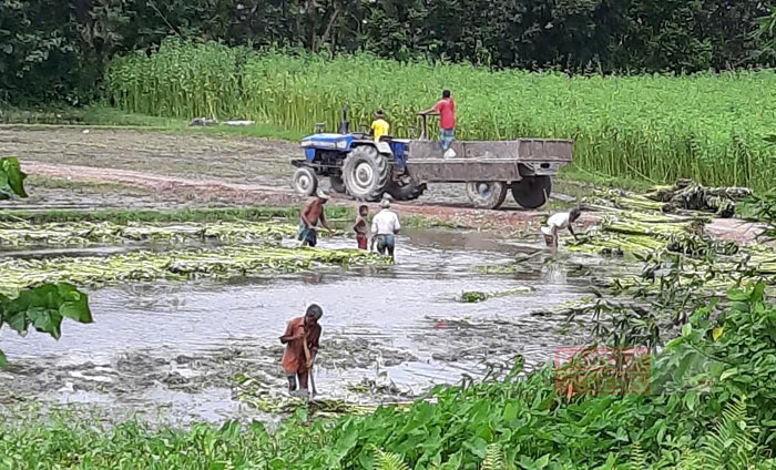 পাট কেটে জলাশয়ে জাগ দিচ্ছেন সৈয়দপুরের চাষিরা। ছবি: আমিরুজ্জামান