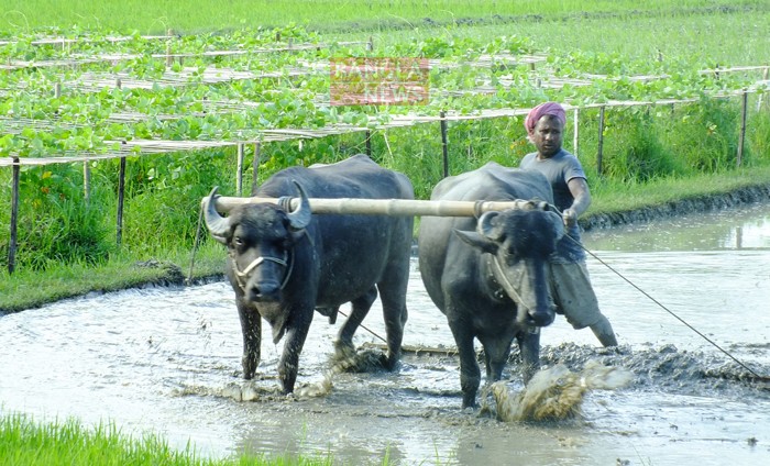 মহিষ দিয়ে ধান চাষের জমি সমান করছেন কৃষক। ঈশ্বরদী-ঢাকা রেলপথের মাঝগ্রাম থেকে ছবিটি তুলেছেন টিপু সুলতান।