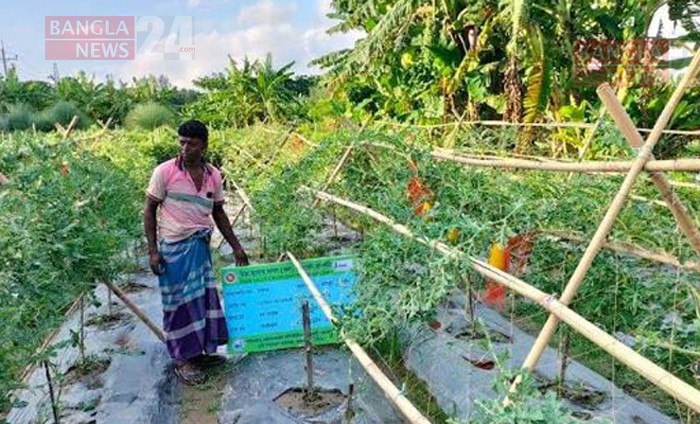 লক্ষ্মীপুরের কমলনগরে মো. সেলিম নামে এক কৃষক পরীক্ষামূলক গ্রীষ্মকালীন তরমুজ চাষ করেছেন। চলতি মৌসুমে শখের বসে ৫০ শতাংশ জমিতে তৃপ্তি, ব্লাক ড্রাগন ও সুইট ড্রাগন জাতের তরমুজ চাষ করেছেন তিনি। ছবি: মো. নিজাম উদ্দিন