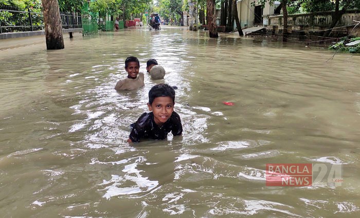 কর্ণফুলী নদীর জোয়ারের পানিতে সৃষ্ট জলাবদ্ধতার মধ্যে শিশুদের খেলা করা। ছবি: সোহেল সারওয়ার