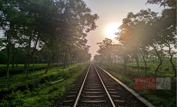 যতদূর চোখ যায় রেললাইনের সমান্তরাল পথ বেয়ে শুধুই সূর্যোদয়ের আলোকিত উচ্ছ্বাস। ছবি: বিশ্বজিৎ ভট্টাচার্য বাপন