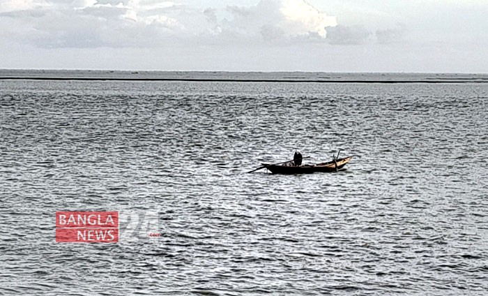 নদীতে ছোট ডিঙি নৌকা দিয়ে মাছ শিকার করছে এক জেলে। লক্ষ্মীপুরের মেঘনা নদী থেকে তোলা। ছবি: মো. নিজাম উদ্দিন