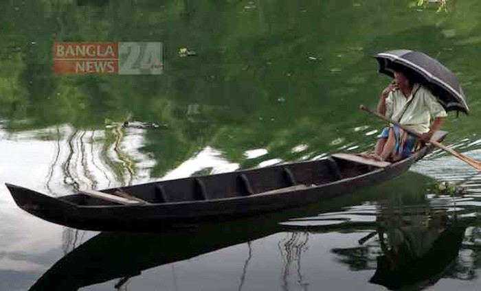 জীবিকার তাগিদে ছাতা মাথায় দিয়ে কাপ্তাই হ্রদে ঘুরছেন এক মাঝি। ছবি: মঈন উদ্দীন বাপ্পী