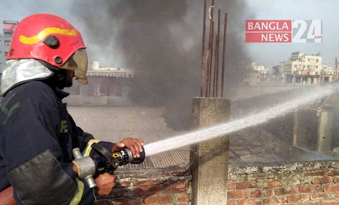 রাজধানীর মাতুয়াইলের প্যাকেজিং কারখানার আগুন নেভাতে ব্যস্ত ফায়ার সার্ভিসের এক সদস্য। ছবি: বাংলানিউজ