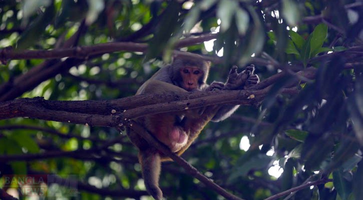 রাজধানীর হাতিরঝিলের একটি গাছে বসে আছে বানর। ছবি: রাজিন চৌধুরী