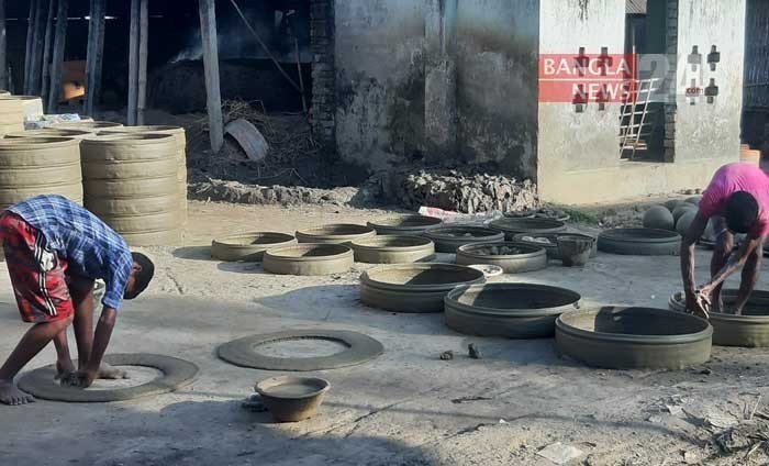 কুয়ার রিং তৈরি করছেন সৈয়দপুরের পালপাড়ার মৃৎশিল্পীরা। ছবি: আমিরুজ্জামান