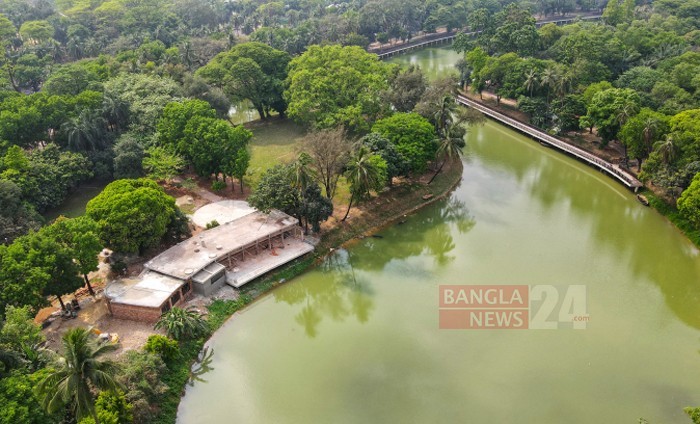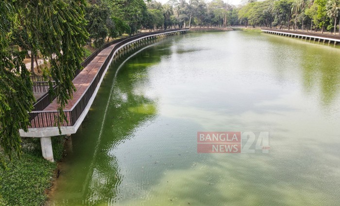 রমনা পার্কের লেকের দুই পাড়ে তৈরি ডেক, যেখানে কাঠের পাটাতনে করা হয়েছে হাঁটার ব্যবস্থা। ছবি: দেলোয়ার হোসেন বাদল