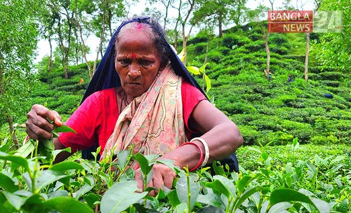 চা-বাগানে পাতা তুলছেন এক শ্রমিক। ছবি: মাহমুদ হোসেন