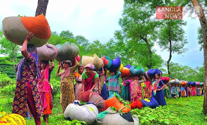 চা-বাগান থেকে পাতা তুলে বোঝা মাথায় নিয়ে সারিবদ্ধভাবে ফিরছেন শ্রমিকরা। ছবি: মাহমুদ হোসেন