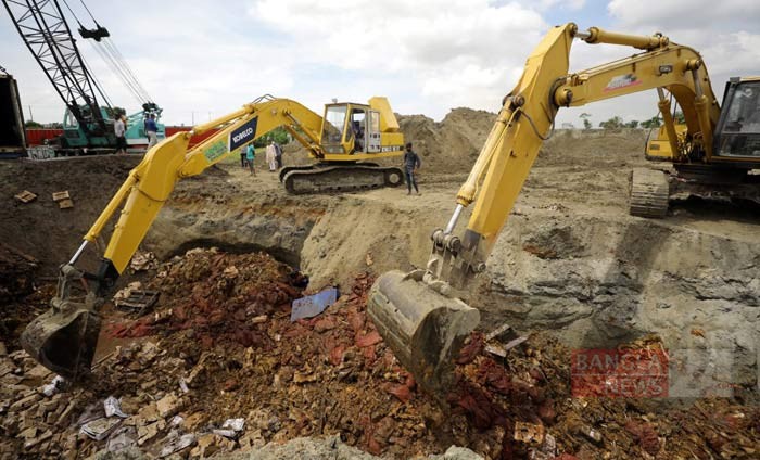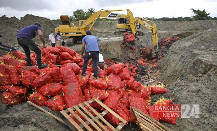 চট্টগ্রাম বন্দর দিয়ে খালাস না হওয়া ৩৮২ কন্টেইনার আমদানি করা পচনশীল পণ্য হালিশহর ডাম্পিংয়ে বিনষ্ট কার্যক্রম চলছে। ছবি: উজ্জ্বল ধর