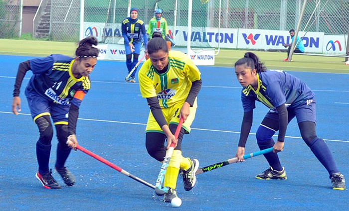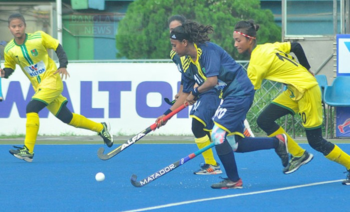 খেলোয়াড়দের হকি খেলা চলছে। ছবিটি মাওলানা ভাসানী হকি স্টেডিয়াম থেকে তুলেছেন শোয়েব মিথুন।