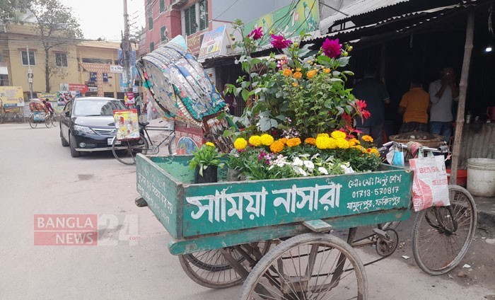 ফরিদপুরের ব্রহ্ম সমাজ সড়কে ভ্যানে করে বিক্রি করা হচ্ছে ফুল গাছ। ছবি: হারুন-অর-রশীদ