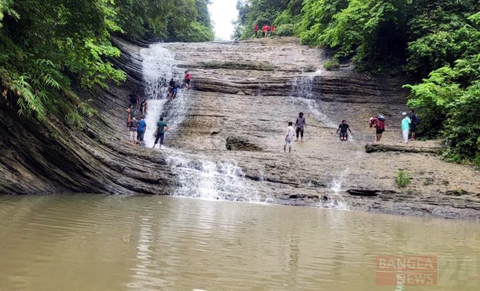প্রকৃতির অপরূপ সৌন্দর্য পাহাড় থেকে নেমে আসা ঝর্ণার জলে আনন্দে মেতেছে পর্যটকরা। ছবি: সঞ্জয় কুমার দত্ত