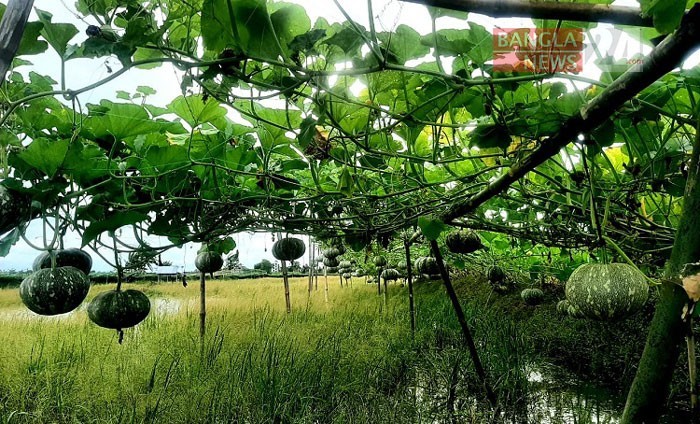 মাচায় ঝুলছে মিষ্টি কুমড়া। সাতক্ষীরার আশাননগর থেকে ছবিটি তুলেছেন শেখ তানজির আহমেদ