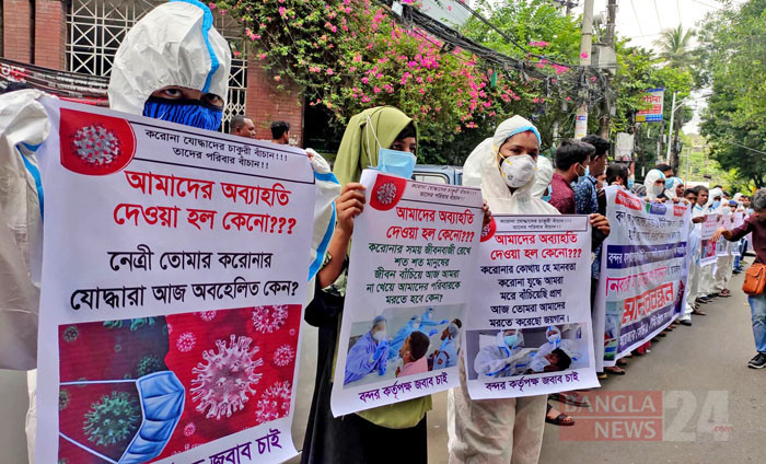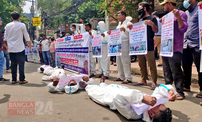 করোনা মহামারির মধ্যে চট্টগ্রাম বন্দর হাসপাতালে অস্থায়ীভাবে চিকিৎসক, নার্স, টেকনোলজিস্ট, ওয়ার্ডবয়, আয়াসহ বিভিন্ন পদে নিয়োগ দেওয়া ১১৯ জনকে অব্যাহতি দেওয়ার প্রতিবাদে মানববন্ধন করেছেন ভুক্তভোগীরা। ছবি: সোহেল সরওয়ার