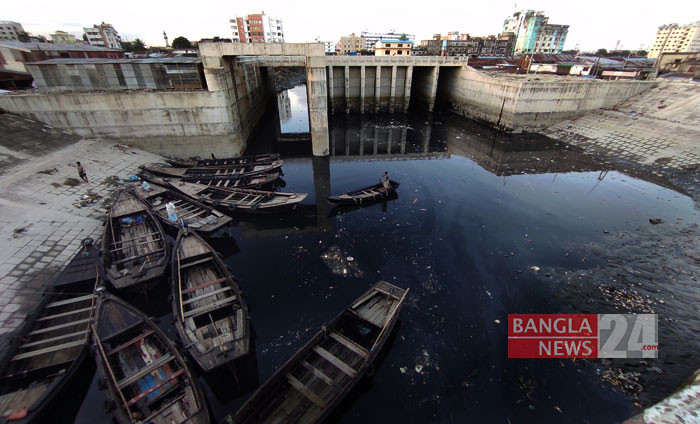 চট্টগ্রাম নগরীর জলাবদ্ধতা দূরীকরণে চাকাতাই খালের মোহনায় স্থাপন করা হয়েছে স্লুইচ গেইট। গেইটের মুখ কালো দূষিত পানিতে সয়লাব। ছবি: উজ্জ্বল ধর