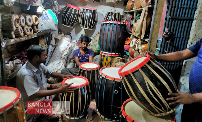 আর মাত্র চার দিন পর দুর্গোৎসব। চট্টগ্রামের পাথরঘাটা এলাকার ঢাক বানানোর কারিগররা ব্যস্ত সময় পার করছে নতুন ঢাক তৈরী ও মেরামতে। ছবি: উজ্জ্বল ধর
