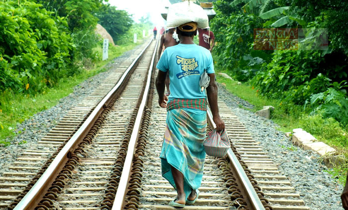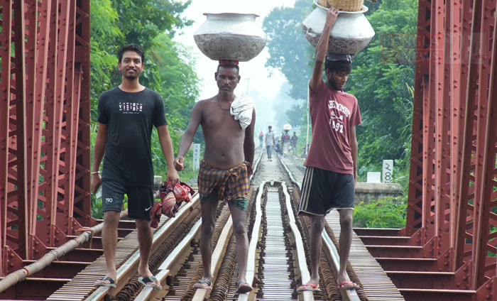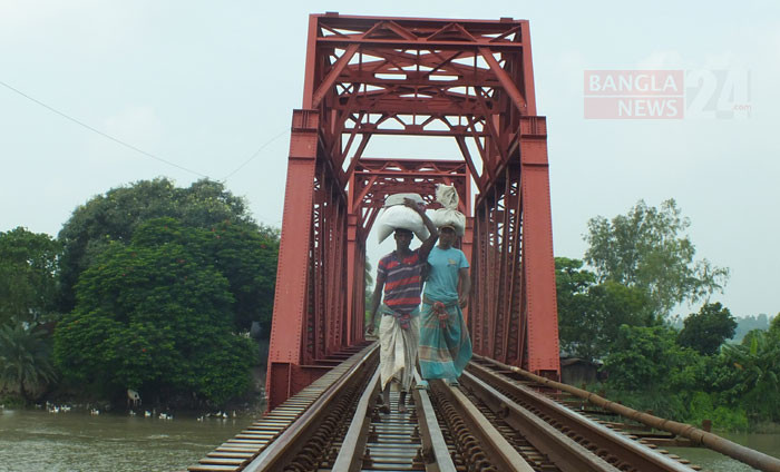 মানুষের চলাচলের জন্য আলাদা কালভার্ট না থাকায় ঝুঁকি নিয়েই রেল ব্রিজ দিয়ে চলাচল করছেন তারা। ঈশ্বরদী-ঢাকা রেলরুটের ভাঙ্গুড়ার দিলপাশা ইউনিয়নের কৈডাঙ্গা ব্রিজ থেকে ছবিটি তুলেছেন টিপু সুলতান।