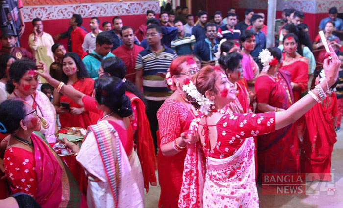 ঢাকের তালে সিঁদুর খেলায় মেতে উঠেছেন সনাতন ধর্মাবলম্বী নারীরা। ছবি: এন আমিন রাসেল