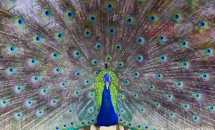 মেঘলা দিনে পেখম তুলে নাচছে ময়ূর। ছবি: দেলোয়ার হোসেন বাদল