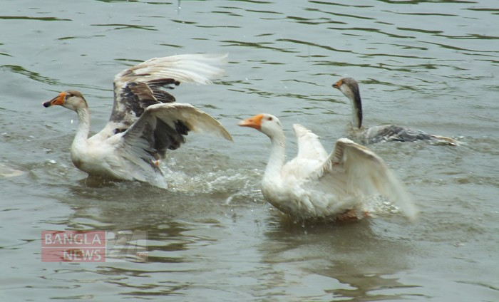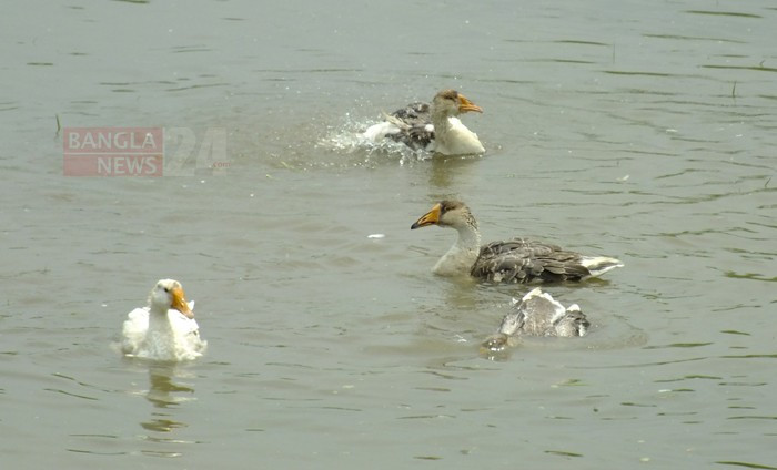 শ্রাবণের বৃষ্টির পানিতে হাঁসের জলকেলি। ঈশ্বরদী উপজেলার পাকশী ইউনিয়নের যুক্তিতলা গ্রাম থেকে ছবিটি তুলেছেন টিপু সুলতান।