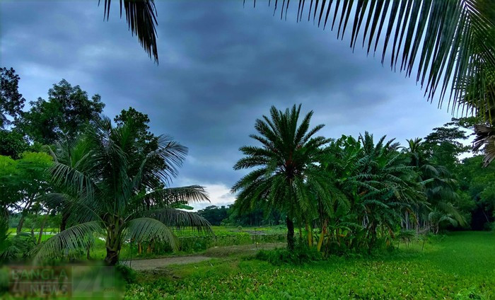 সবুজের সমারোহ ঢেকে যাচ্ছে কালো মেঘে। গ্রাম বাংলার চির চেনা এক অপরূপ দৃশ্য। ছবি: জুনায়েদ আহমেদ