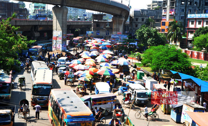 রাজধানীর যাত্রাবাড়ী মোড়ে সড়কের অর্ধেক অংশ হকারদের দখলে। ছবি: শাকিল আহমেদ