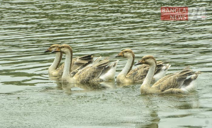 সোহরাওয়ার্দী উদ্যানের লেকে ভেসে বেড়াচ্ছে রাজহাঁস। ছবি: ডিএইচ বাদল