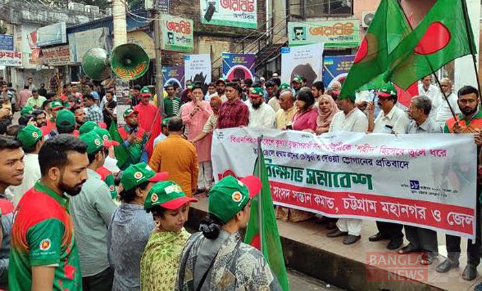 বিএনপির বিভাগীয় মহাসমাবেশে যুদ্ধাপরাধী সালাউদ্দিন কাদের চৌধুরীকে শহীদ বলে আখ্যা দেয়ার প্রতিবাদে চট্টগ্রাম প্রেসক্লাবের সামনে মানববন্ধন ও বিক্ষোভ সমাবেশ করে মুক্তিযোদ্ধা সন্তান কমান্ড চট্টগ্রামে মহানগর ও জেলা শাখা। ছবি: উজ্জ্বল ধর