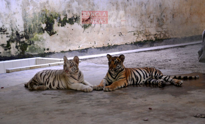 খাঁচার ভেতর থেকে বাঘ শাবক দুটি মানুষের ভিড় দেখছে। জাতীয় চিড়িয়াখান থেকে ছবি তুলেছেন জিএম মুজিবুর।