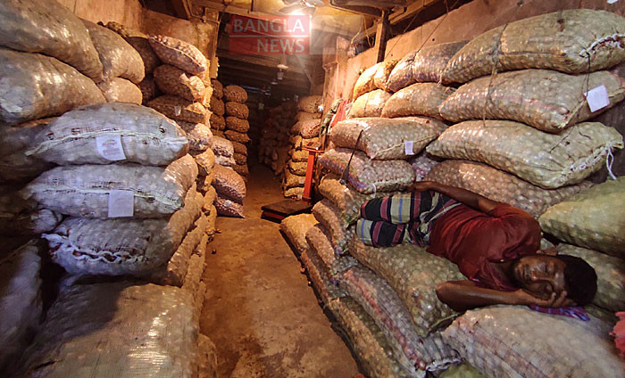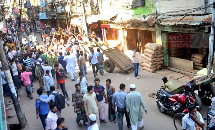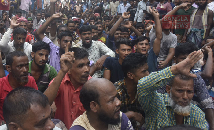ছুরিকাঘাতে শ্রমিক হত্যার প্রতিবাদে শ্রমিকদের বিক্ষোভ ও কর্ম বিরতিতে অচল হয়ে পড়ে দেশের অন্যতম পাইকারী বাণিজ্যিক কেন্দ্র খাতুনগঞ্জ। ছবি: উজ্জ্বল ধর