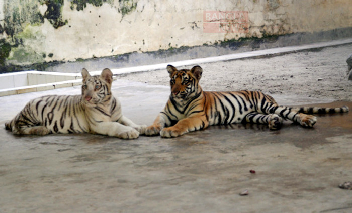 জাতীয় চিড়িয়াখানার মেঝেতে বসে আছে বাঘের শাবক। ছবি: জিএম মুজিবুর