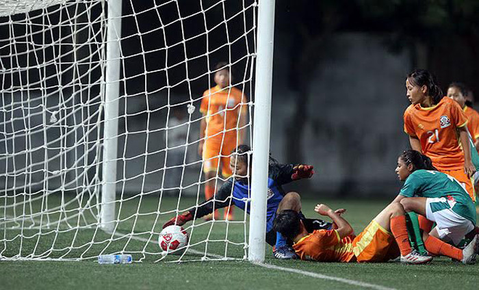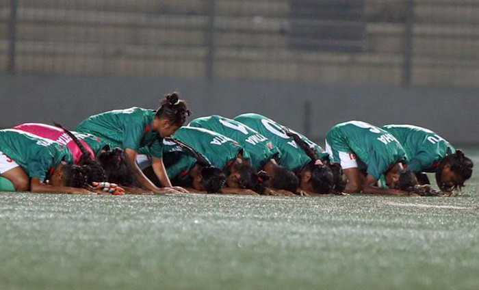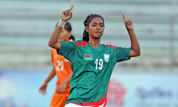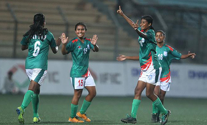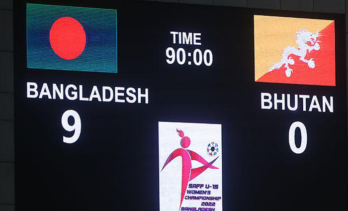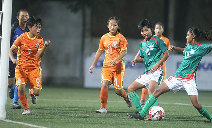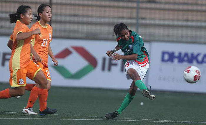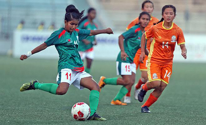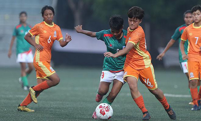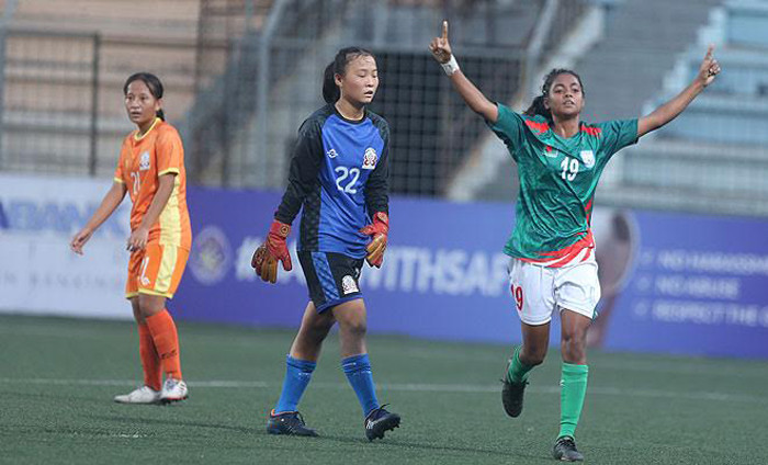 সাফ অনূর্ধ্ব-১৫ নারী চ্যাম্পিয়নশিপের ম্যাচে ভুটানের বিপক্ষে জয় পেয়েছে বাংলাদেশ। ছবি: শোয়েব মিথুন