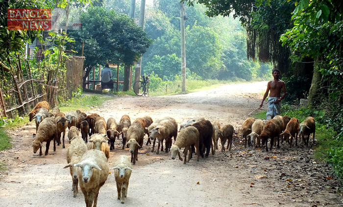 ঘাস খাওয়াতে ভেড়ার পাল নিয়ে যাচ্ছেন এক যুবক। ছবিটি ঈশ্বরদীর লক্ষ্মীকুণ্ডা ইউনিয়ন থেকে তুলেছেন টিপু সুলতান।