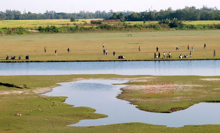 নদীর বুকে জেগে ওঠা চরে খেলায় মেতেছে কিশোর-তরুণরা। ছবি: সোলায়মান হাজারী ডালিম।