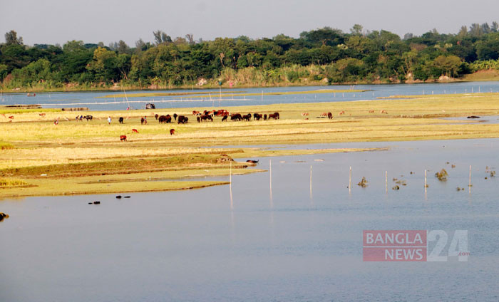 ফেনী নদীর বুকে জেগে উঠা চরে গরু-মহিষের বিচরণ। ছবি: সোলায়মান হাজারী ডালিম।