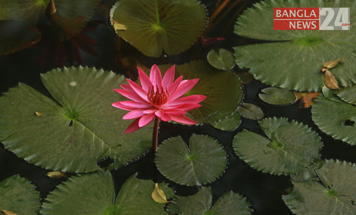 জাহাঙ্গীরনগর বিশ্ববিদ্যালয়ের পুকুরে লাল শাপলার হাসি। ছবি: রাজীন চৌধুরী
