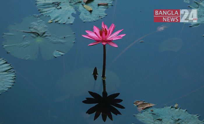 পুকুরের পানিতে মুগ্ধতা ছড়াচ্ছে লাল শাপলা ফুল। ছবি: রাজীন চৌধুরী