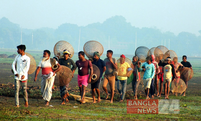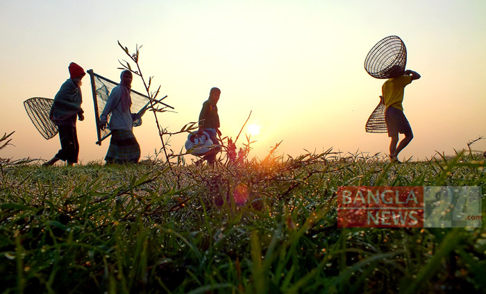 ভোরের আলো ফুটছে, শিশির ভেজা মাঠ মাড়িয়ে পলো নিয়ে মাছ শিকারে যাচ্ছেন সব বয়সী সৌখিন মৎস্য শিকারীরা। ছবি- টিপু সুলতান