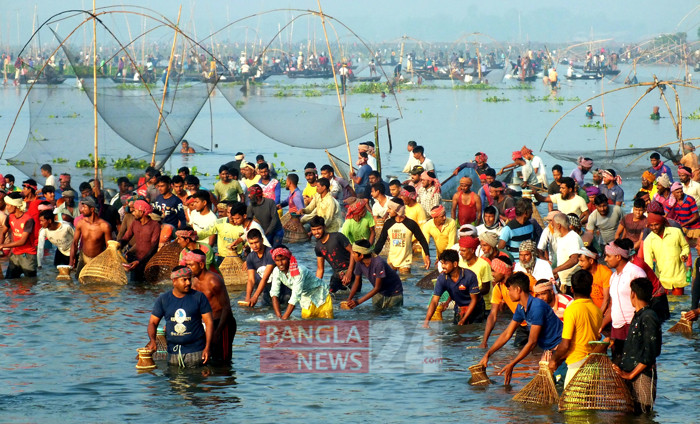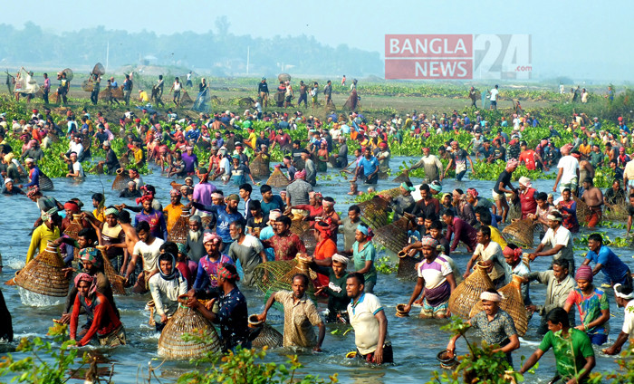 পলো নিয়ে মাছ শিকারে নেমেছেন সব বয়সী সৌখিন মৎস্য শিকারী। ছবি- টিপু সুলতান