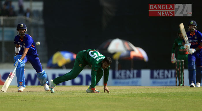 মিরপুরের শেরে বাংলা জাতীয় ক্রিকেট স্টেডিয়ামে তিন ম্যাচ ওয়ানডে সিরিজের প্রথমটিতে টস হেরে ব্যাট করতে নামে ভারত। ছবি: শোয়েব মিথুন